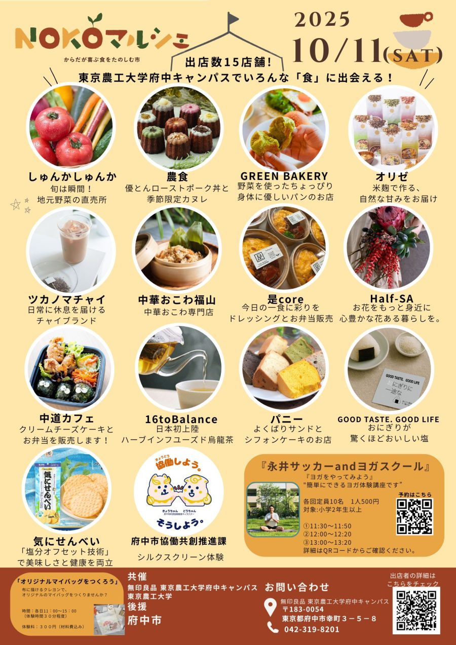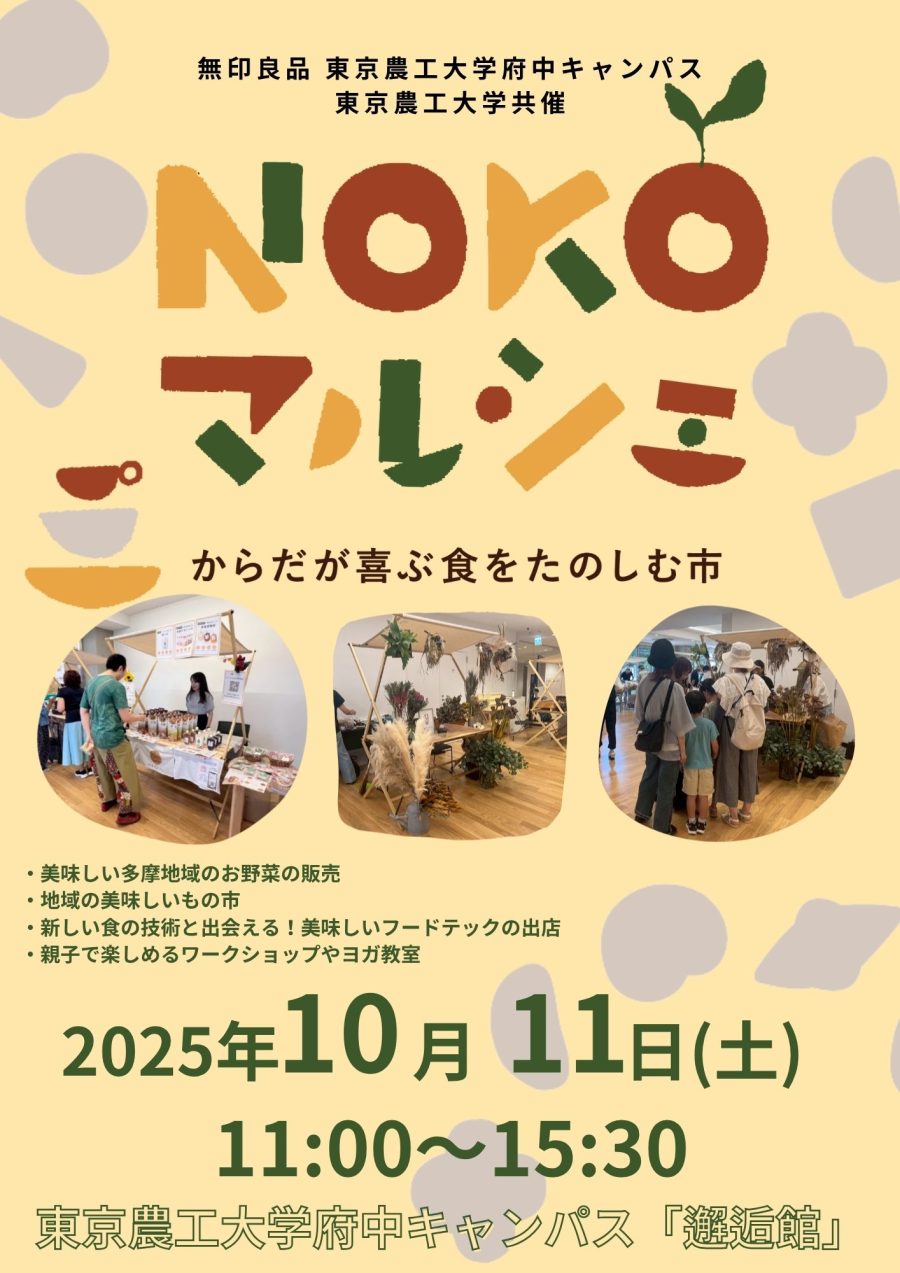 からだが喜ぶ食の体験を楽しめるマルシェイベント「NOKOマルシェ」が、2025年10月11日(土)11:00〜15:30に無印良品 東京農工大学府中キャンパス 邂逅館(かいこうかん)で開催されます。無印良品と東京農工大学の共催によるこのイベントでは、地域の恵みを感じることができ、様々な「食」に出会うことができます。秋の週末、みんなで楽しめるイベントです。