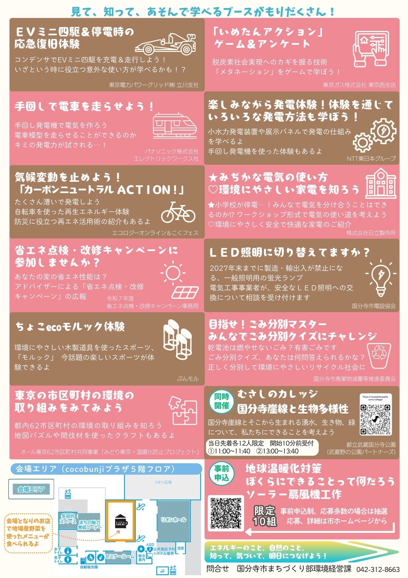| 協力 | エコロジーオンライン&こくフェス NTT 東日本グループ オール東京62 市区町村共同事業「みどり東京・温暖化防止プロジェクト」 国分寺市電設協会 国分寺市廃棄物減量等推進委員会 東京ガス株式会社 東京西支店 東京電力パワーグリッド株式会社 立川支社 パナソニック株式会社 エレクトリックワークス社 株式会社日立製作所 ぶんモル 武蔵野の公園パートナーズ 令和7 年度省エネ点検・改修キャンペーン事務局 |