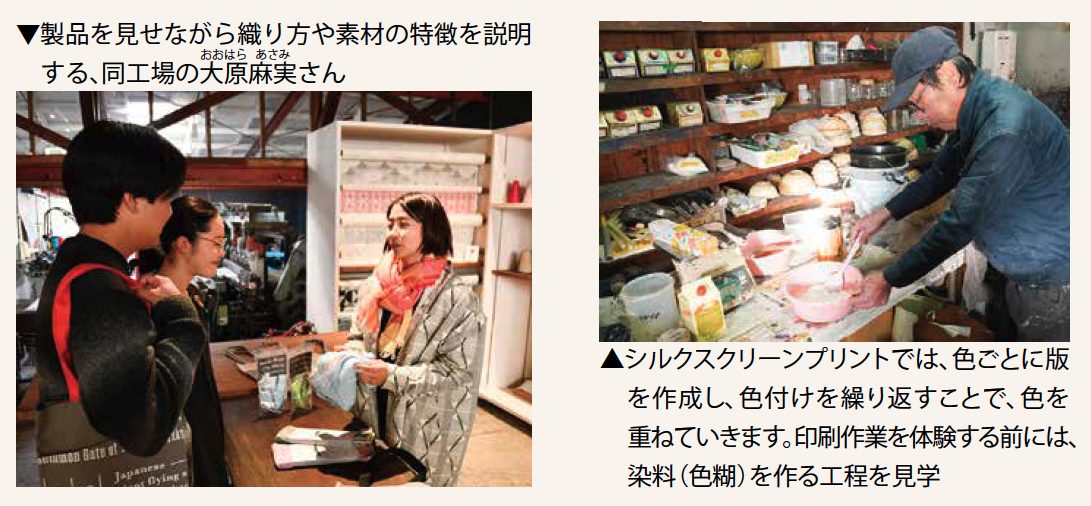 製品を見せながら、織り方や素材の特徴について説明を受けることで、染物がどのような工程を経て完成するのかを学びます。色ごとに版を作成し、色付けを繰り返して重ねていくことで、一つの柄が完成していく様子は、伝統技法ならではの丁寧な仕事ぶりを感じさせます。奥田染工場では、染料(色糊)を作る工程の見学や印刷作業の体験が可能です。