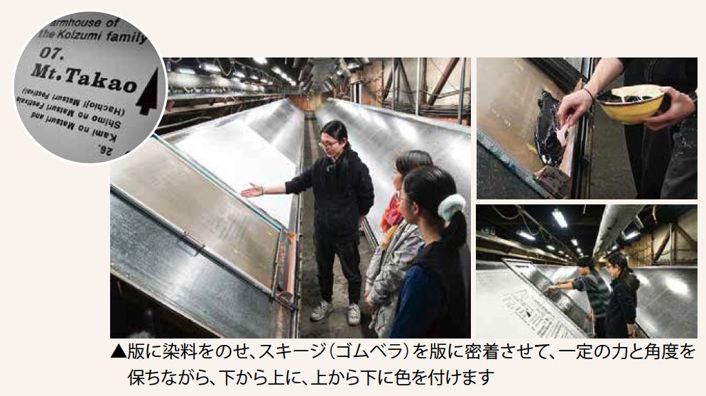 作業場には、約25メートルの鉄板が並ぶ「捺染台(なっせんだい)」と呼ばれる設備があります。ここを移動しながら、道具の使い方や力の入れ方といった染色のコツを、職人から直接教えてもらい、いよいよ実践です。