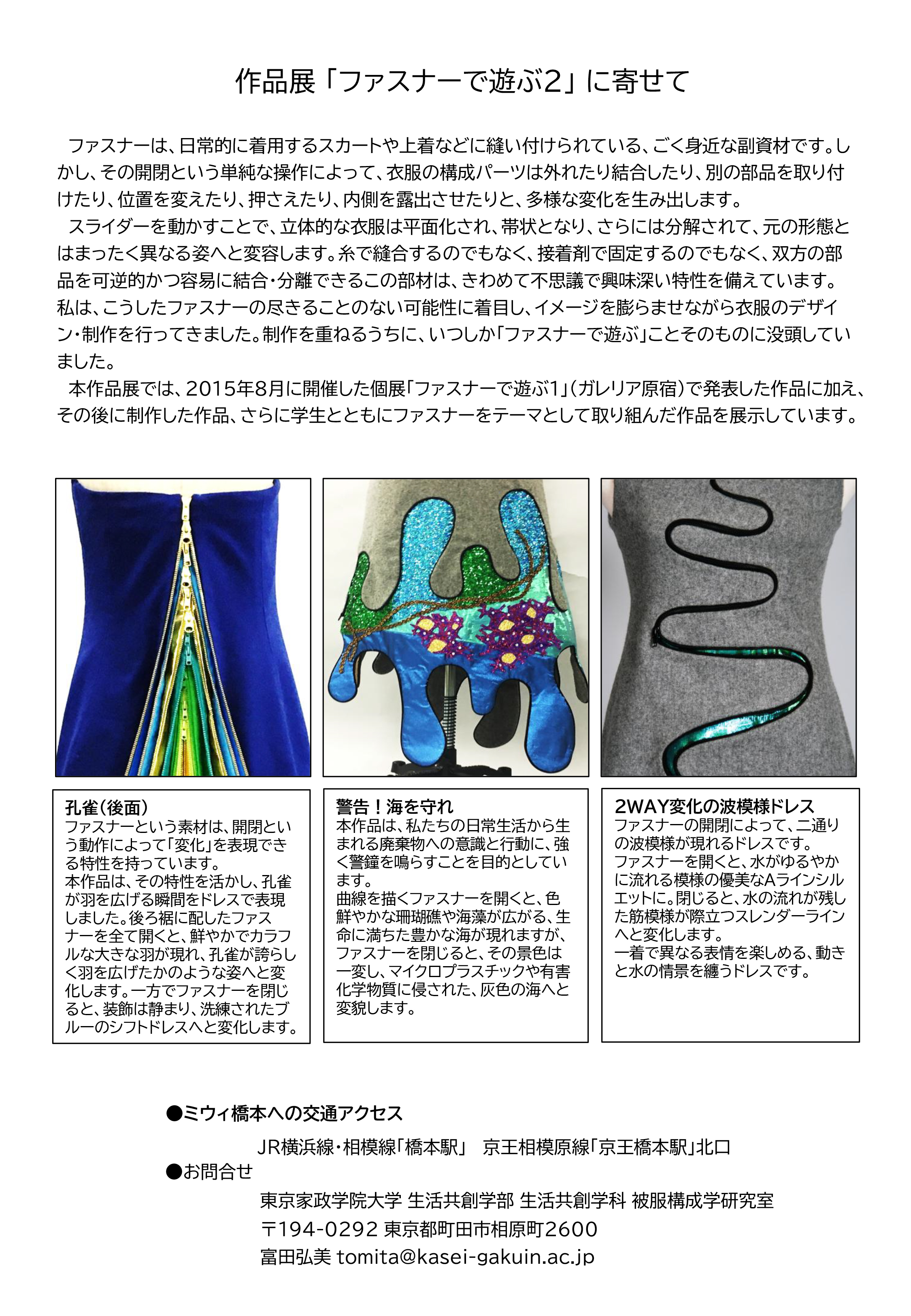 この作品展では、2015年8月にガレリア原宿にて開催された個展「ファスナーで遊ぶ1」で発表された作品に加え、それ以降に制作した作品や、学生とともに取り組んだ作品も展示されます。ぜひご来場ください。