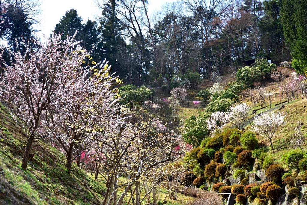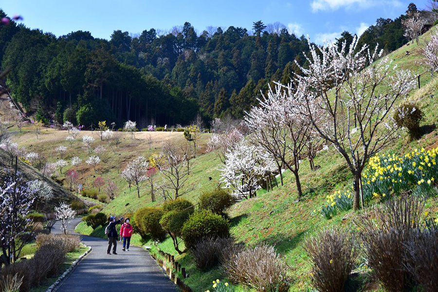 吉野梅郷のメインストリート・神代橋通りを抜けた先にある「梅の公園」には、約150品種を超える梅と春の花が咲き誇ります。