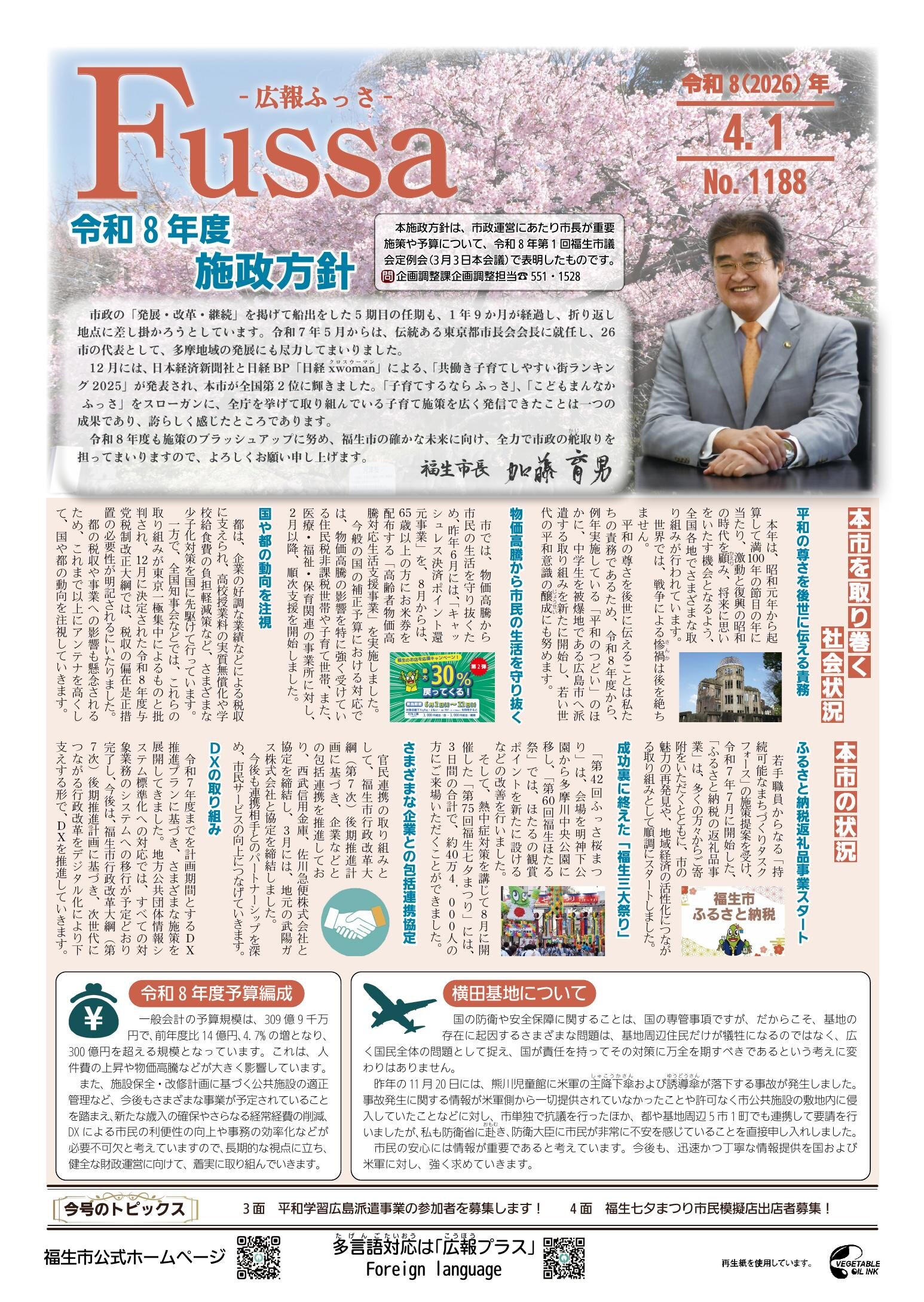 広報ふっさ 令和8年3月15日号 電子ブックを読む 電子ブックを読む 広報ふっさ 令和8年3月15日号 エリア 福生市 カテゴリー 広報誌 発行日 2026年03月15日 掲載団体 福生市 関連URL 東京都福生市公式ホームページ 電子ブックの紹介 第四十三回 ふっさ桜まつり 3面 パブリックコメントの結果について 5面 ごみ・リサイクルカレンダ今号のトピックス ーは届きましたか? 6面 保健事業日程表 ※掲載されている電子ブックの内容等に関するお問い合わせは、掲載団体へ直接お問い合わせください。 関連する電子ブック 福生市 広報ふっさ 令和8年4月1日号 広報誌 福生市 広報ふっさ 令和8年3月1日号 広報誌 福生市 広報ふっさ 令和8年2月15日号 広報誌 福生市 広報ふっさ 令和8年2月1日号 広報誌 福生市 広報ふっさ 令和8年1月15日号 広報誌 福生市 広報ふっさ 令和8年1月4日号 広報誌